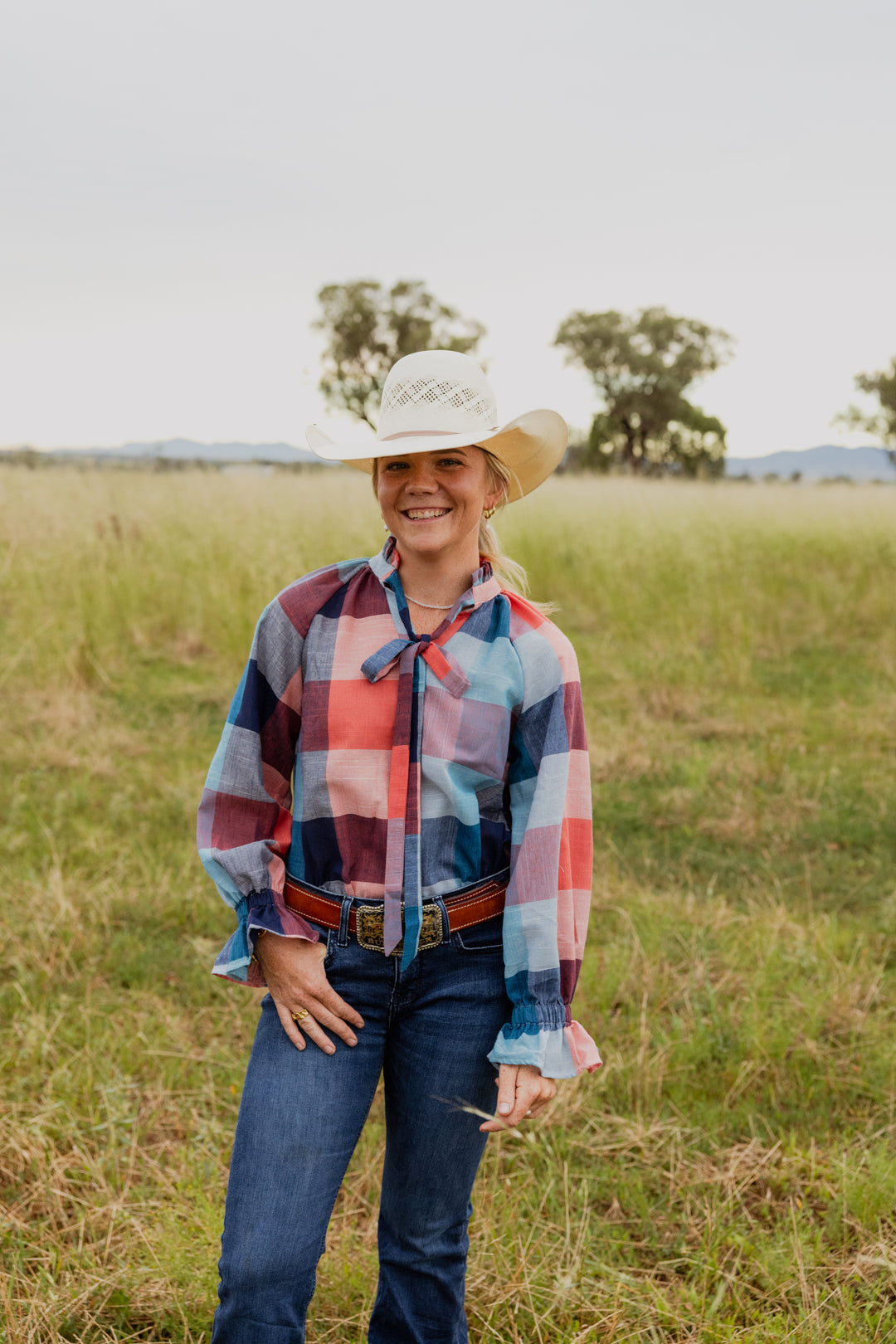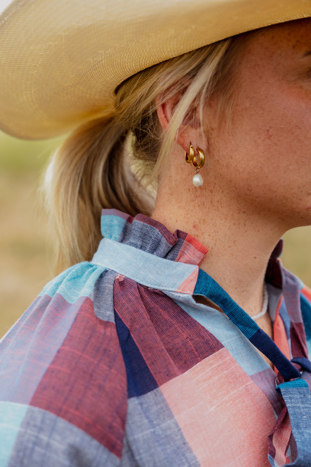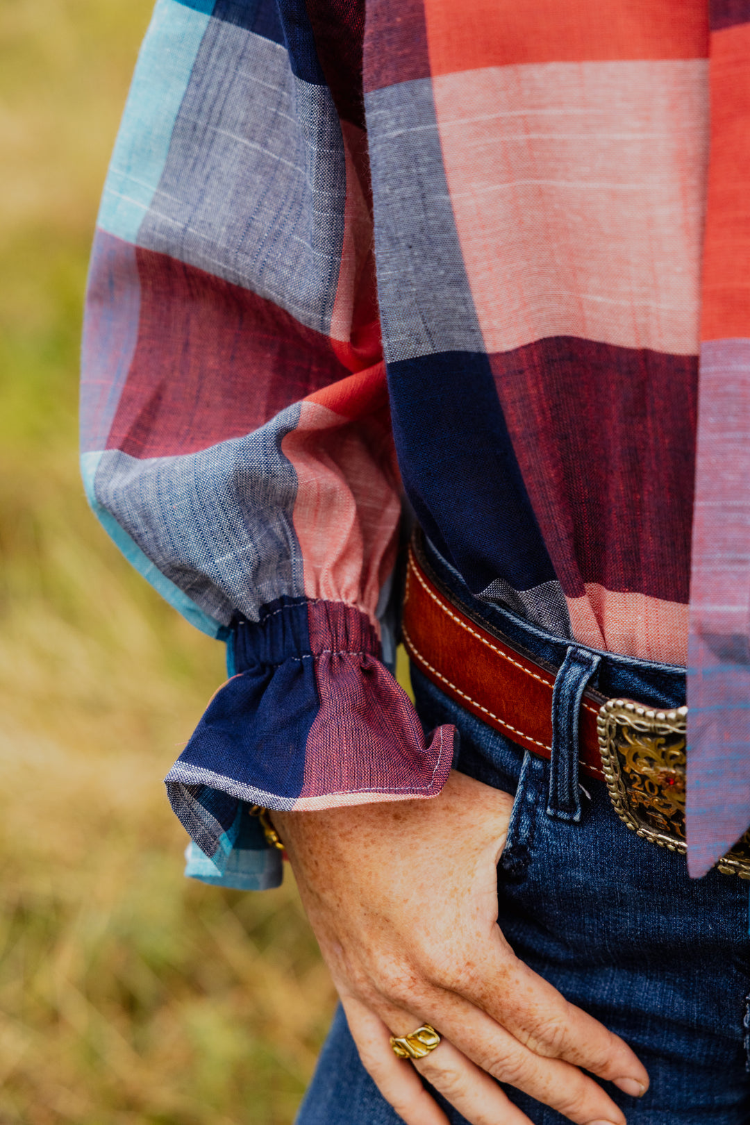 This Gabby design is an adaptation of the celebrated Nikki silhouette, offering a spacious fit. Carefully constructed from 100% cotton, this half-button pullover features a stylish necktie and ruffled collar. Cuffs are adjustable and adorned with ruffled detailing, accompanied by a cotton tie to match.