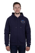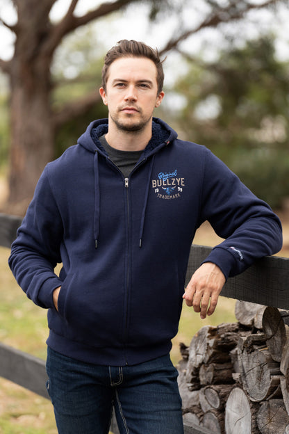 Heavy weight brushed fleece jacket with hood, sherpa lined hood and body for warmth, small chest print with large feature Bullzye back print, side welt pockets, branded metal trims, rib hem band, cuffs and pocket opening, logo label on hood and sleeve