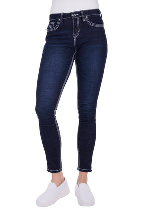 Super Skinny - 29 Inch Leg, mid rise, stretch fabric, five pocket styling, logo embroidery on back waistband, feature embroidery on back pockets, logo button and rivets, contrast all over top stitch