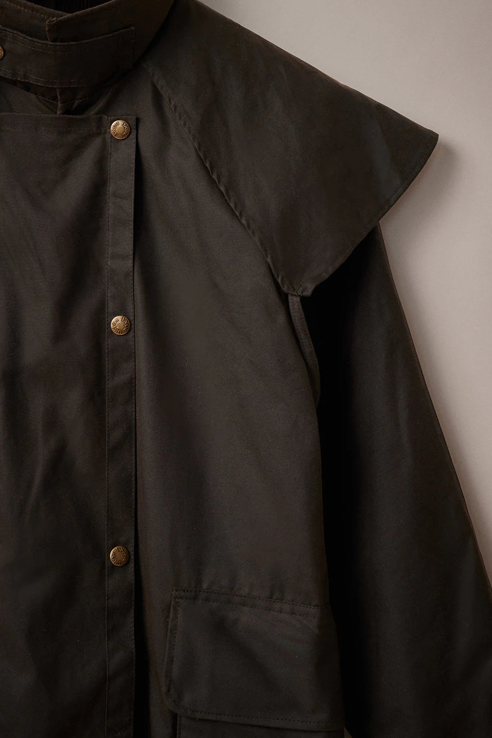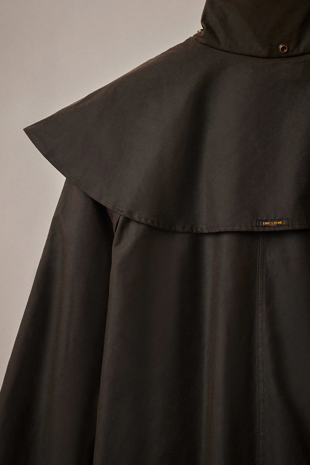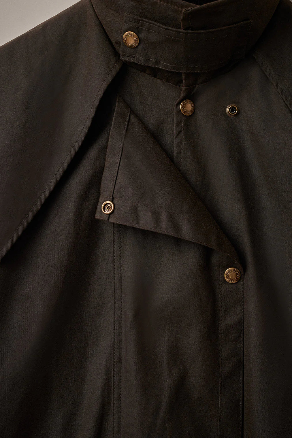 The Ranger is a shorter adaptation of our Rider Coat. Made from our premium wind and water resistant heavy weight oilskin, this style is favoured by farmers and campers with its wide storm cape, double entry pockets, snap closures and raglan sleeve that allows for greater movement and a jumper to be worn underneath. Made in Australia