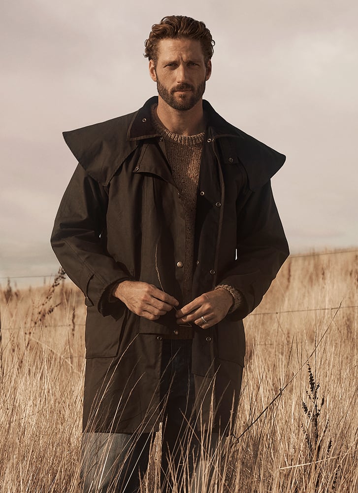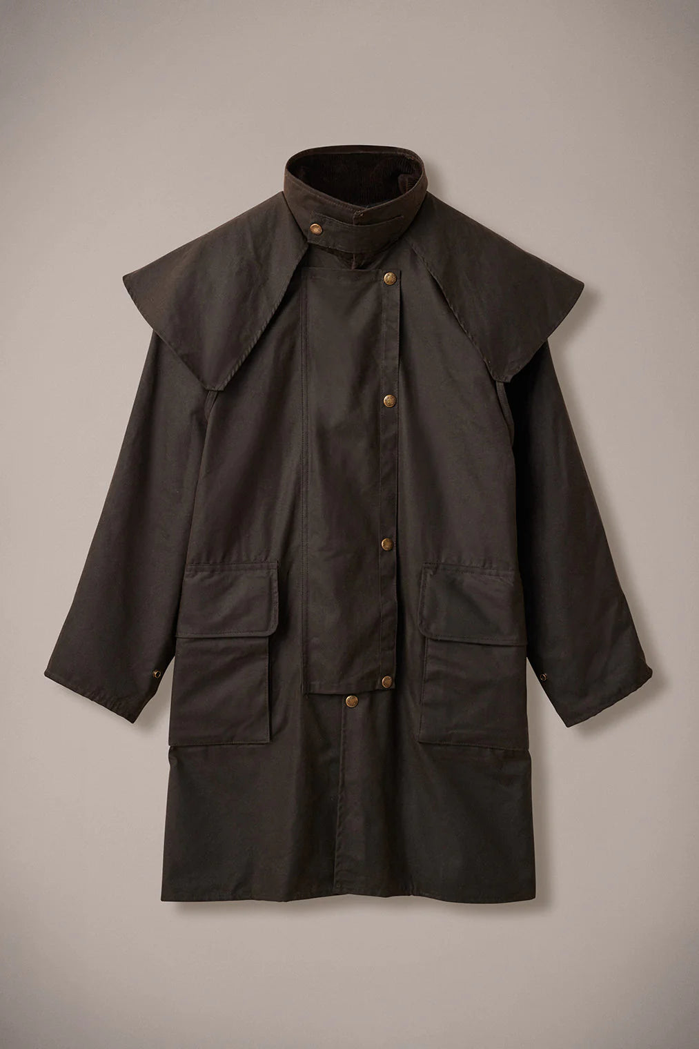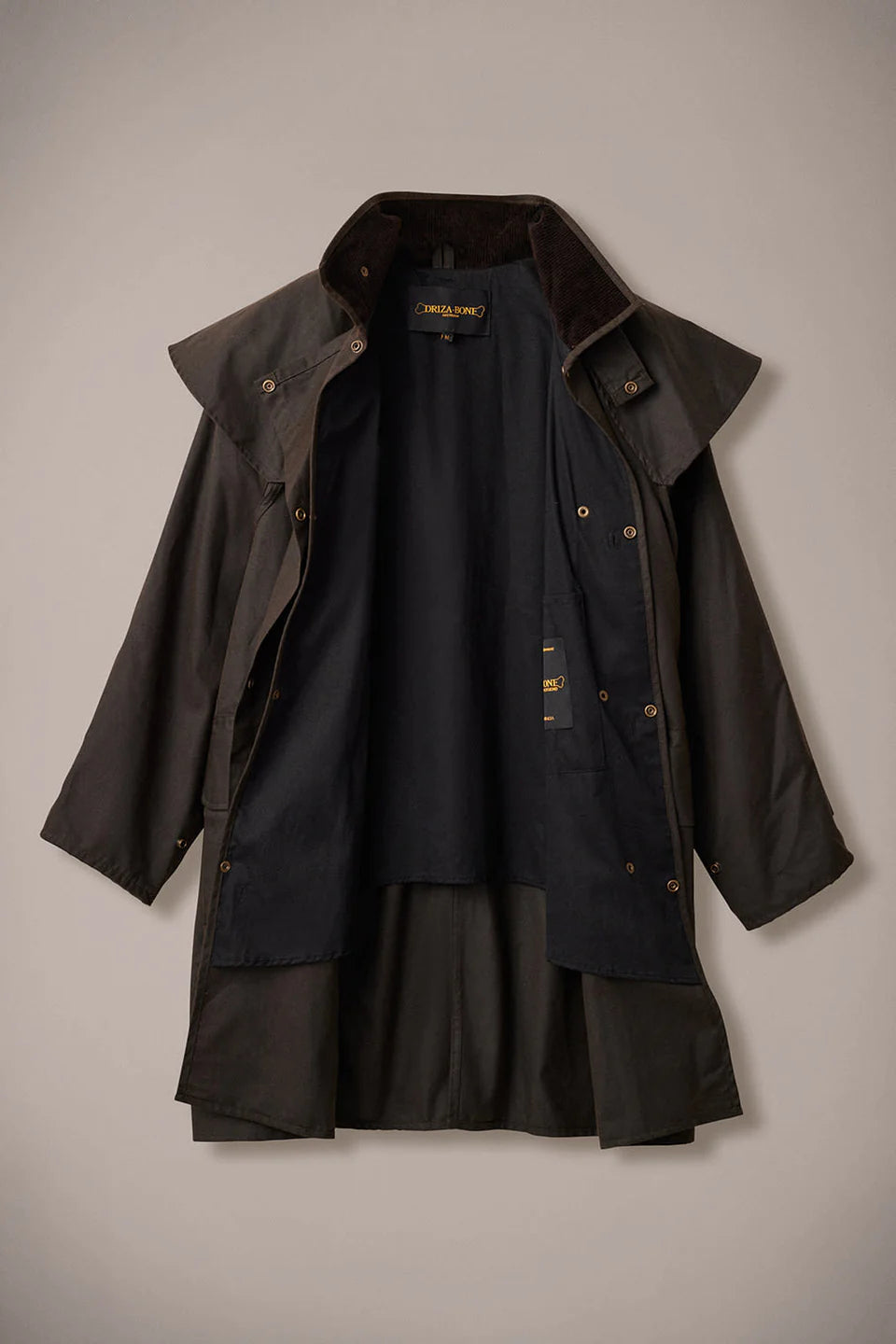 The Ranger is a shorter adaptation of our Rider Coat. Made from our premium wind and water resistant heavy weight oilskin, this style is favoured by farmers and campers with its wide storm cape, double entry pockets, snap closures and raglan sleeve that allows for greater movement and a jumper to be worn underneath. Made in Australia