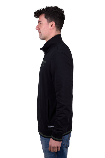 Medium weight french terry 1/4 zip pullover, contrast rib trim on inner collar facing, front welt pockets, rib trim (pockets, neck, hem and cuffs), contrast stripe tipping on rib hem and cuffs, Wrangler® iconic logo hem label