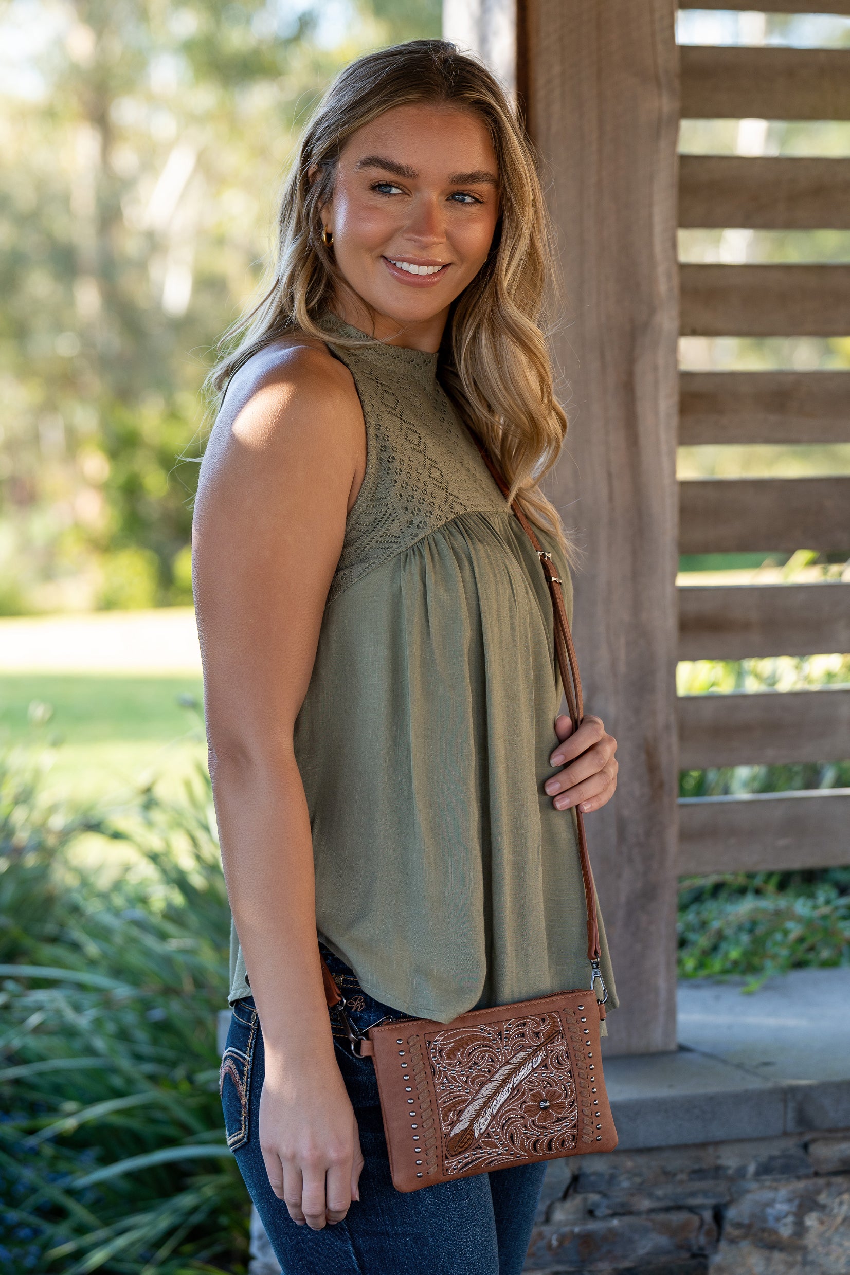 Embroidery on front panel, cut out design with inlay, stud detail, top zip closure, removable and adjustable long strap, removable wristlet, internal zip and card pockets, Pure Western metal badge, fully lined