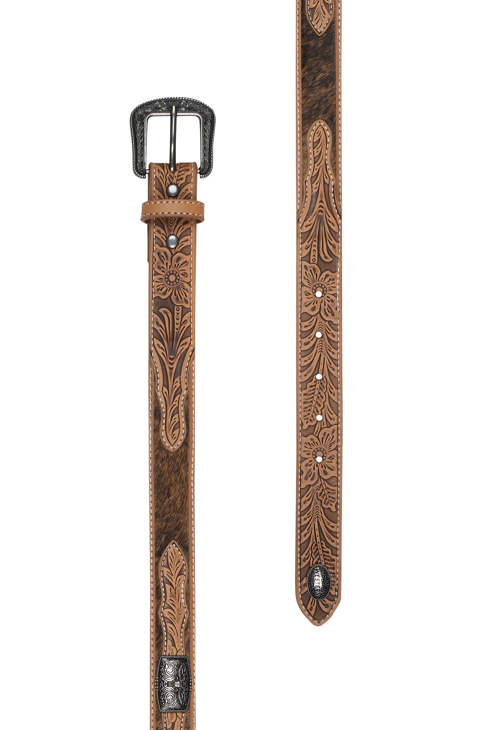 Genuine hair-on cowhide strap, tooled tabs, longhorn conchos, removable buckle, Pure Western concho, antique silver hardware