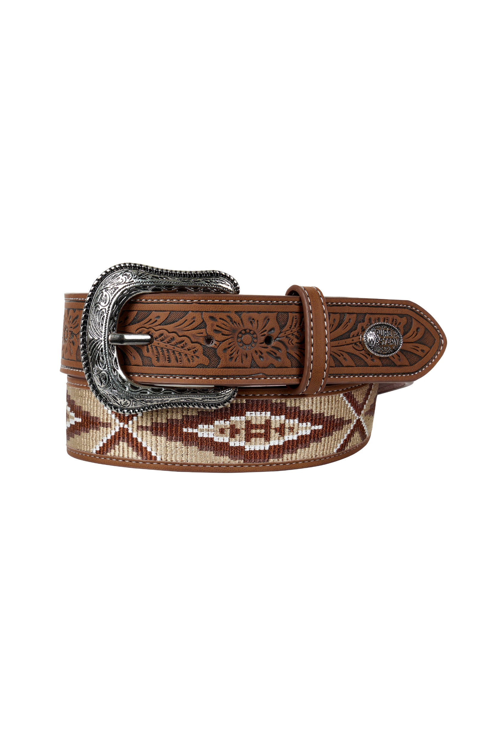Aztec embroidery design, tooled tab ends, Pure Western concho, removable buckle, antique silver hardware