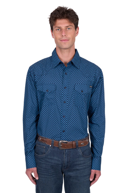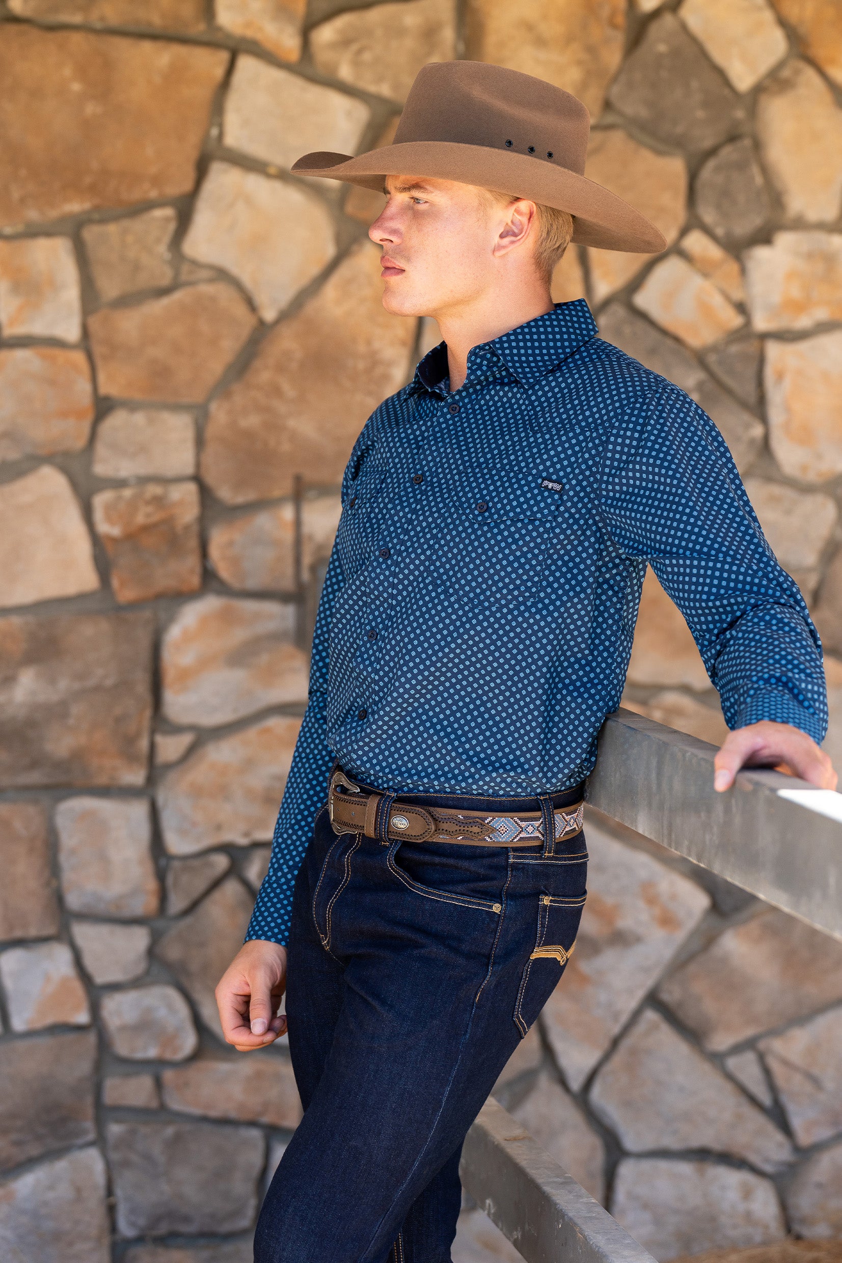 Classic western long sleeve shirt, button closure, western chest pockets, one with pen holder, western front and back yokes, contrast trim on inside collar stand, triple needle stitch detail on yokes and armholes