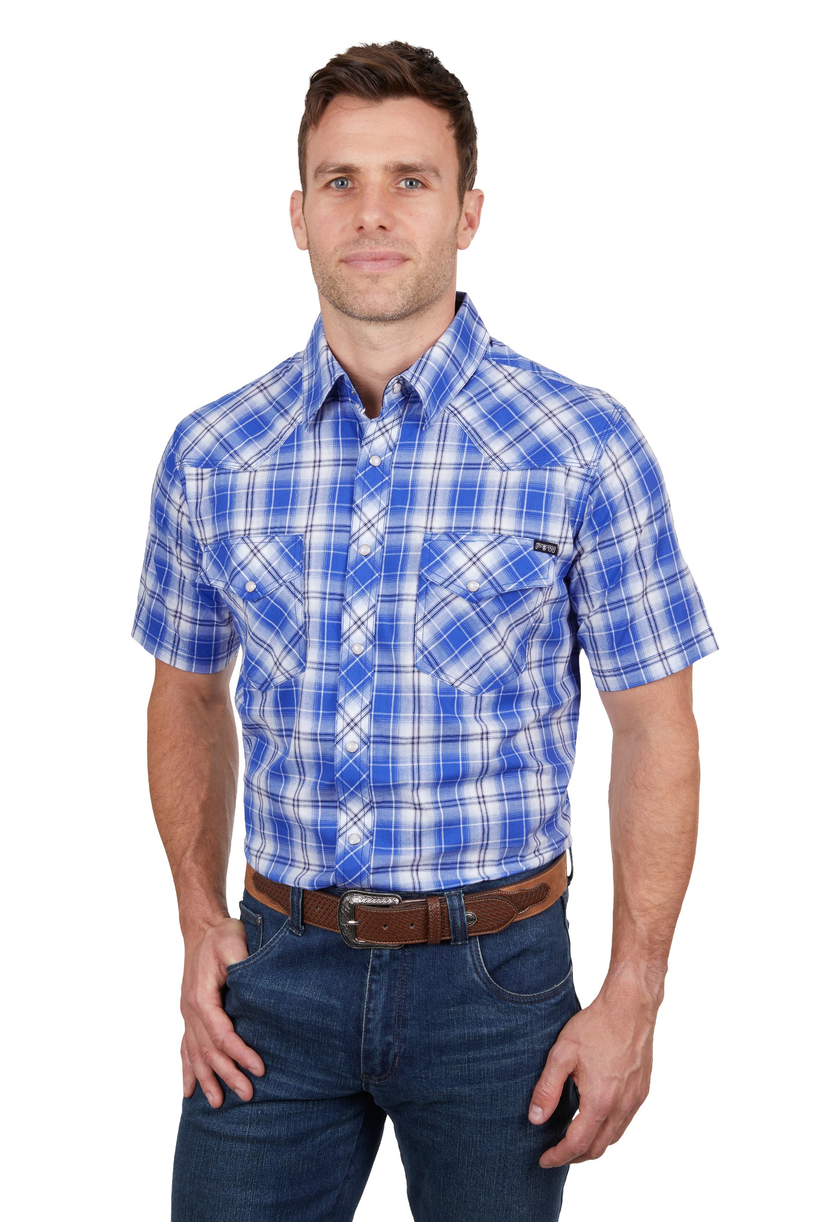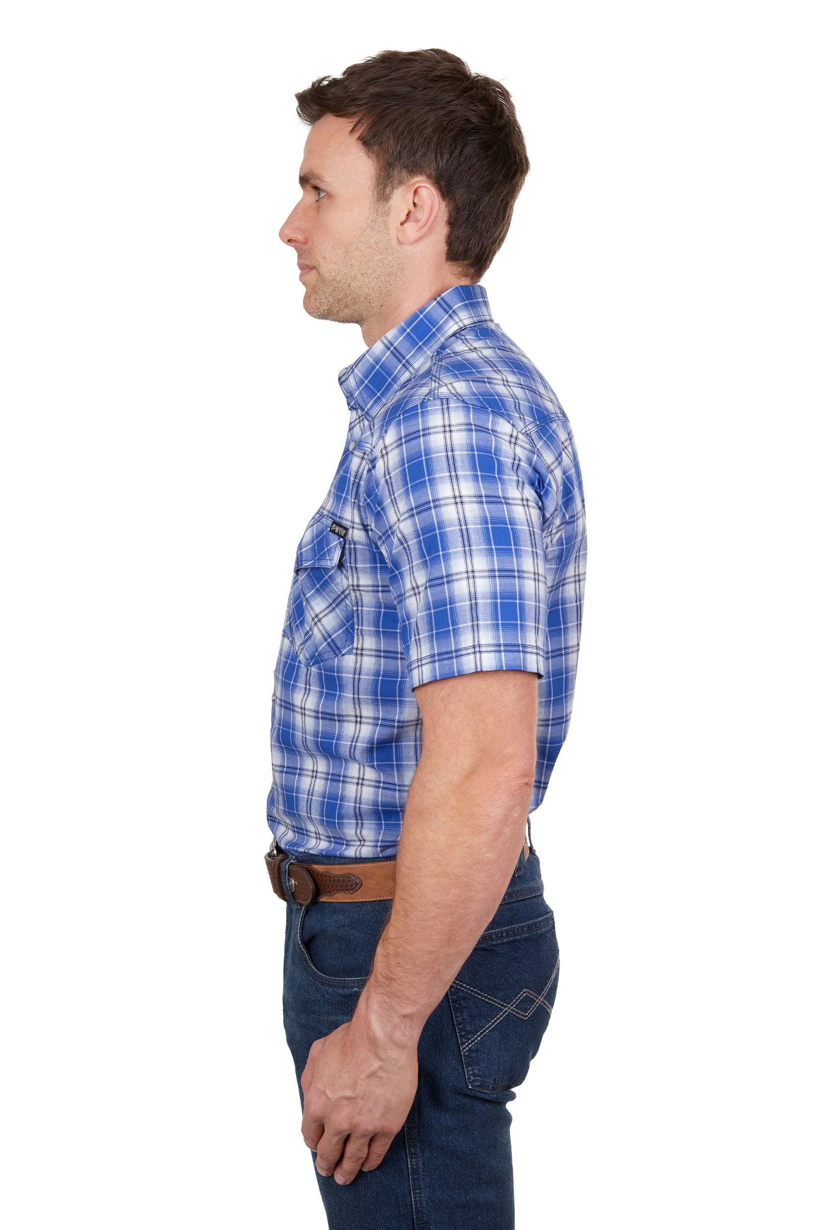 Classic western short sleeve shirt, snap closure, western chest pockets, one with pen holder, western front and back yokes, contrast trim on inside collar stand, triple needle stitch detail on yokes and armholes