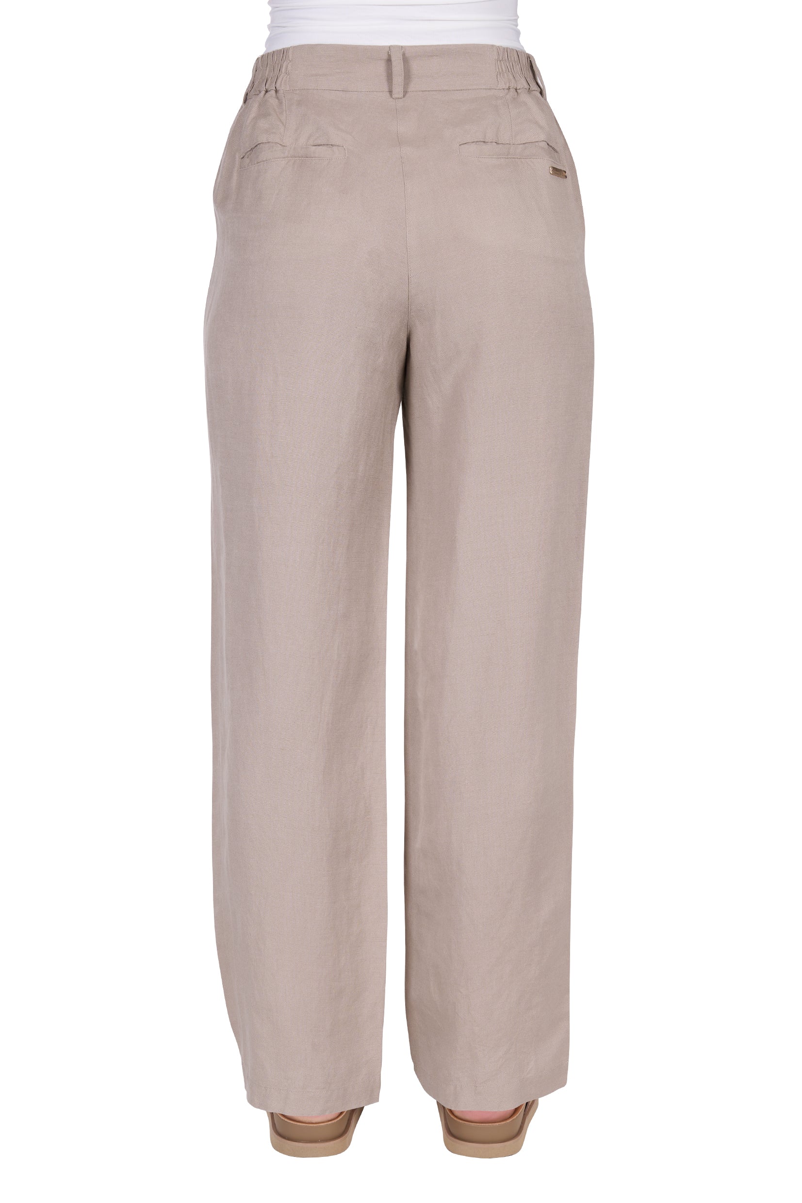 Relaxed trouser leg with front pleats, linen blend, breathable linen blend fabric to keep you cool, contrast stripe inner waistband, elasticated side waistband with flat front for a flattering fit, angled front pockets