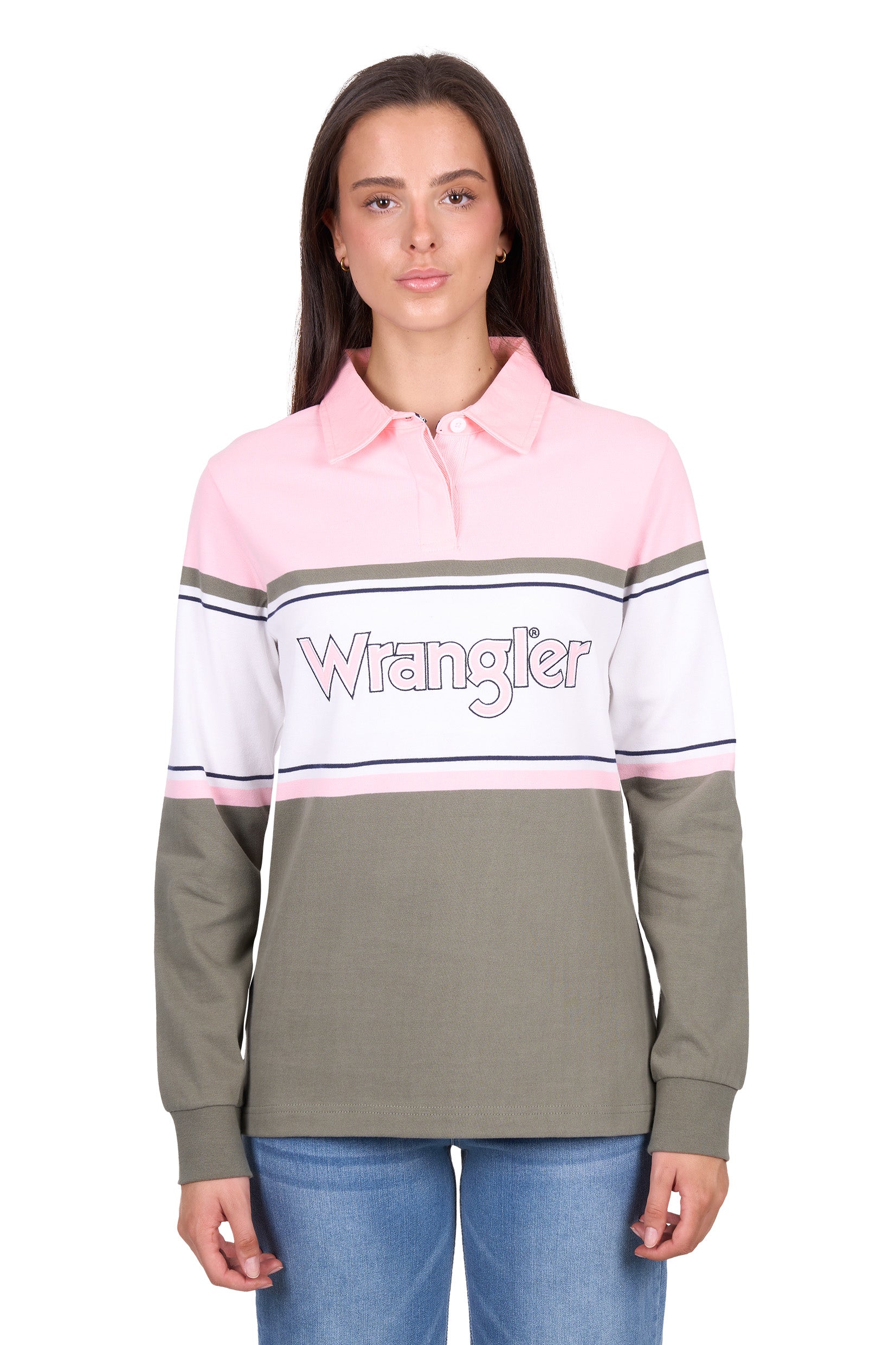 Heavyweight jersey knit rugby, concealed buttons on centre front placket, cotton drill collar, Wrangler® iconic logo herringbone tape on back neck and inside side seam splits, rib trim cuffs