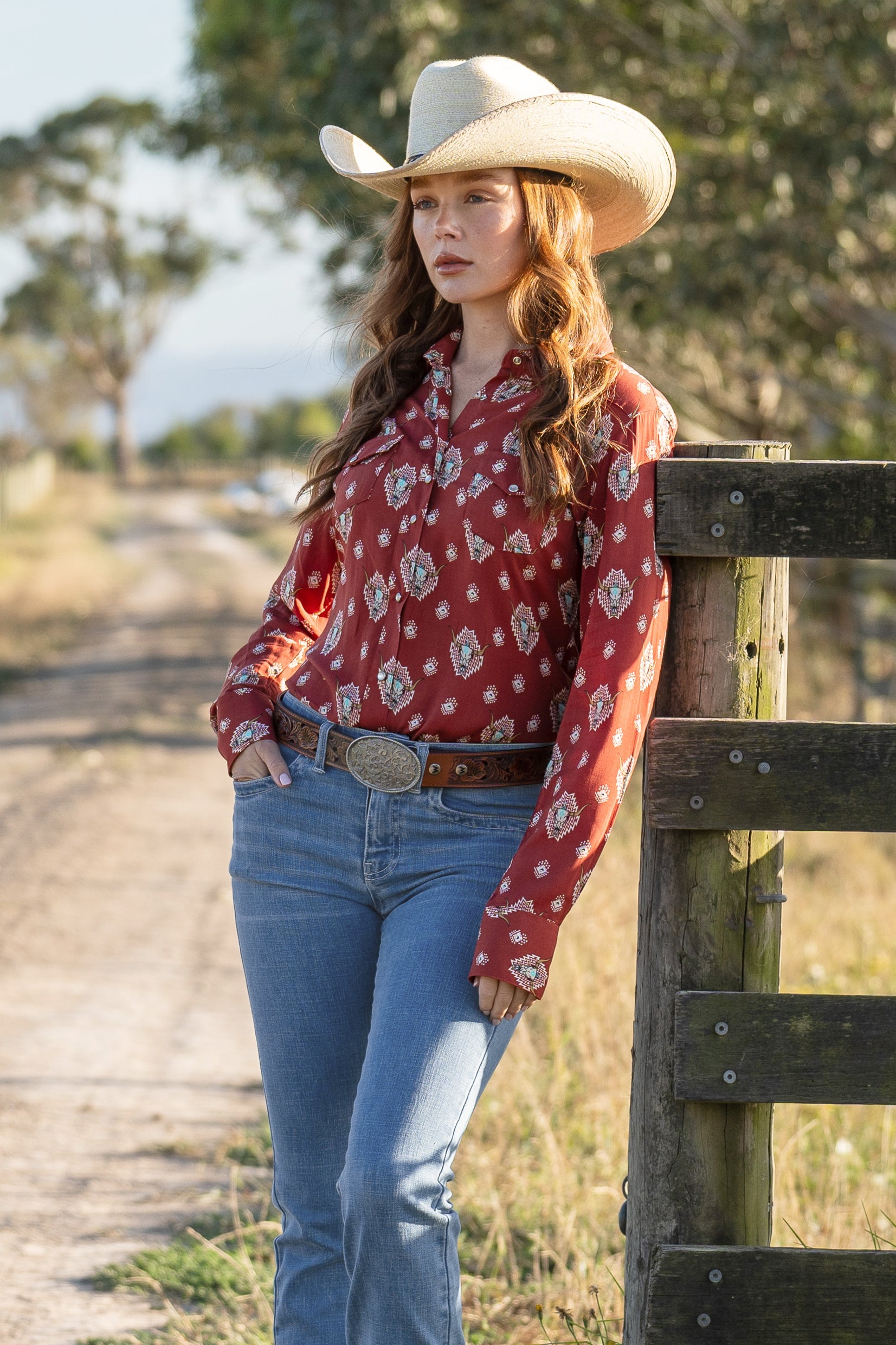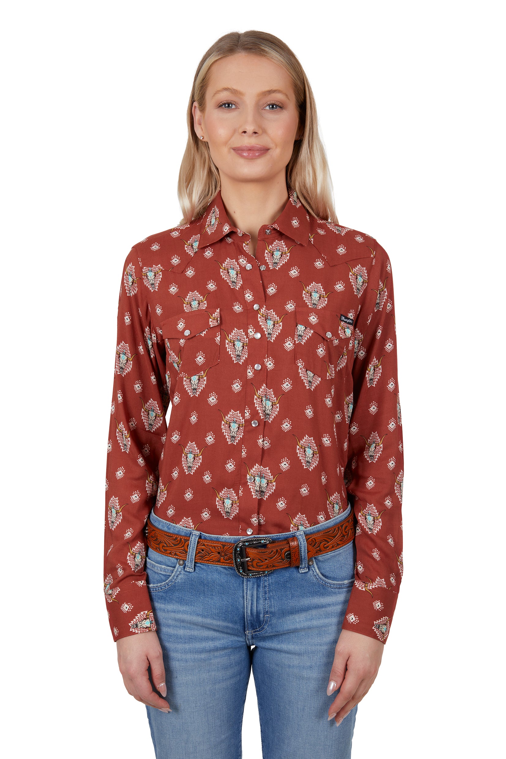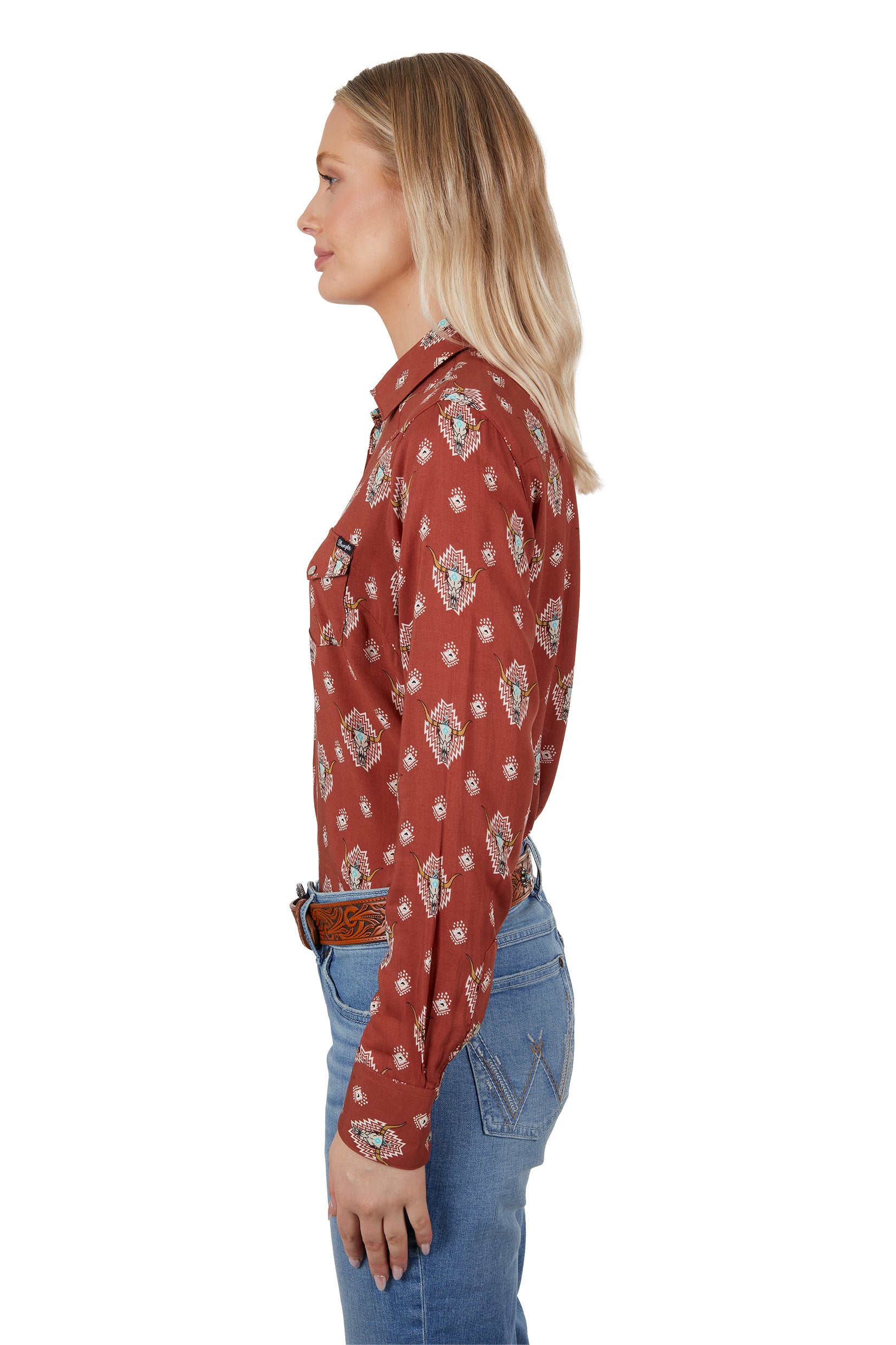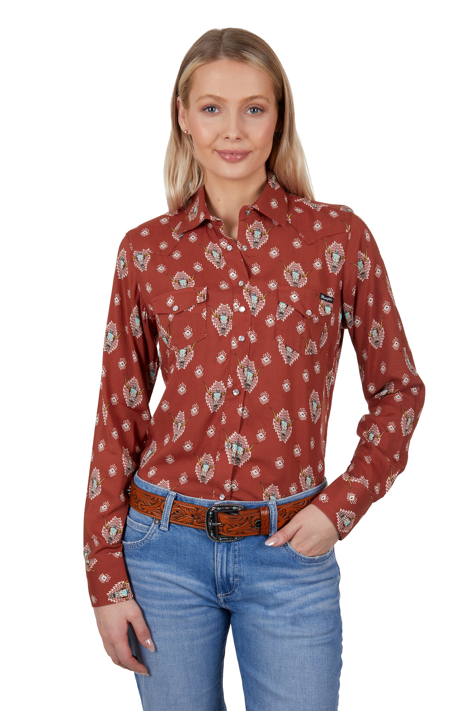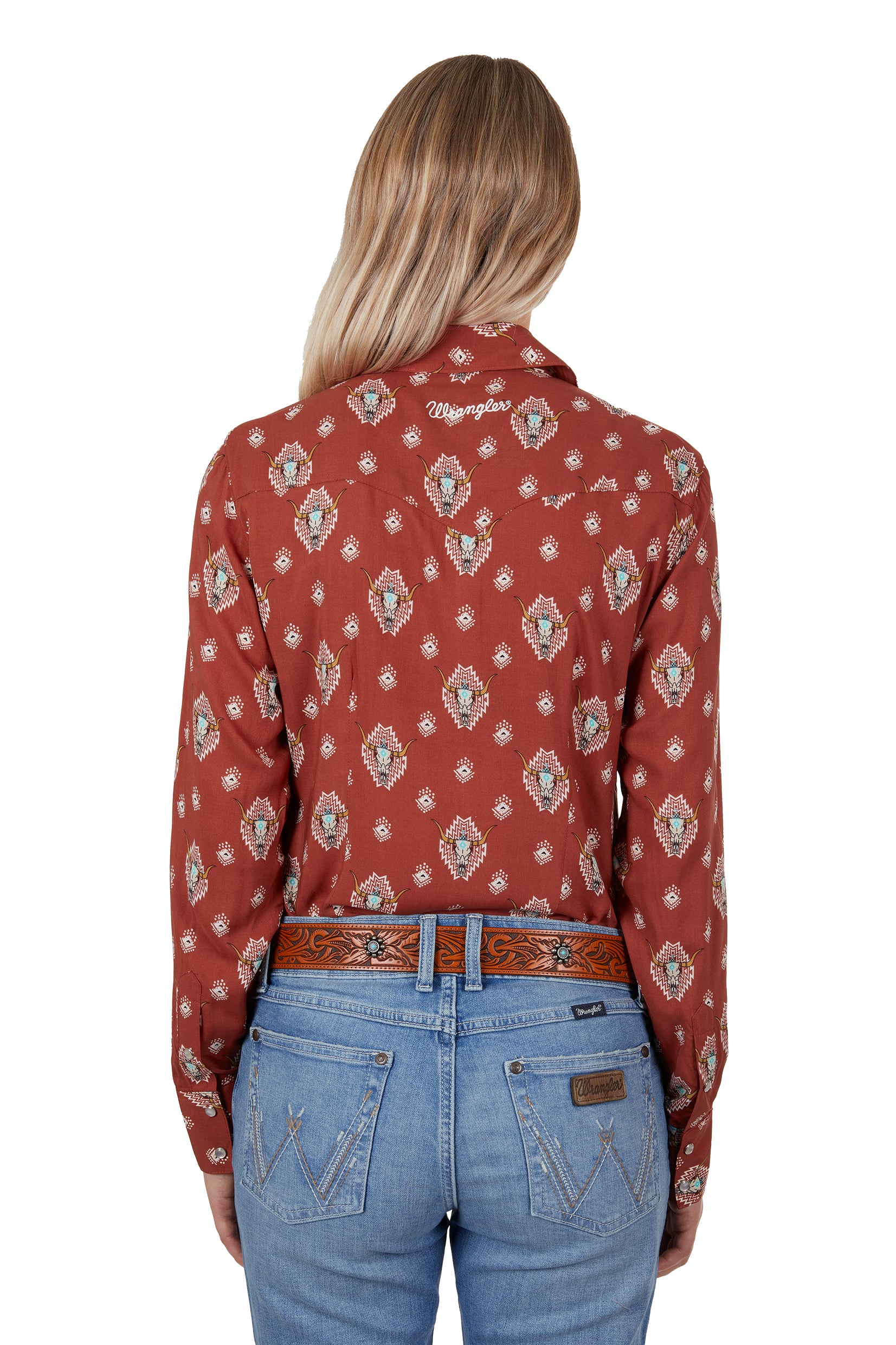 Classic western long sleeve shirt, steerhead and Aztec print, pearl snap closure, western chest pockets, western front and back yokes, Wrangler® logo pip on side seam, soft handfeel and drape